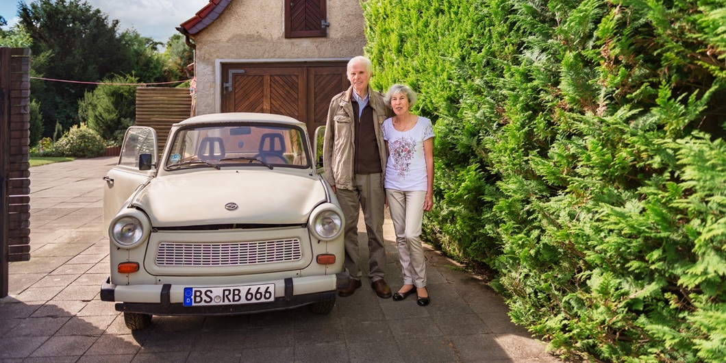 Bildunterschrift: Ehepaar Blume neben dem Kult-Trabi auf dem heimischen Hof in Wendhausen © Braunschweigisches Landesmuseum, Anja Pröhle