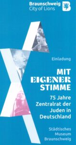 Das Städtische Museum Braunschweig präsentiert vom 24. Februar bis zum 20. September im Haus am Löwenwall die Ausstellung „Mit eigener Stimme. 75 Jahre Zentralrat der Juden in Deutschland“. Diese deutschlandweit einzige Schau beleuchtet die Geschichte des Zentralrats. Und sie zeigt seine lebendige Kultur- und Bildungsangebote, sein vielfältiges gesellschaftliches Engagement und vor allem seine Bedeutung für die Entwicklung der Demokratie in der