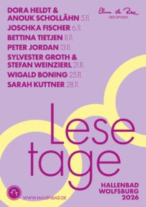 Vom 5. Bis 28. November 2026 wird das Wolfsburger Hallenbad erneut zu einem Ort, an dem gesellschaftliche Debatten, persönliche Geschichten und literarische Qualität aufeinandertreffen. Mit Joschka Fischer, Dora Heldt, Sarah Kuttner, Sylvester Groth, Wigald Boning, Bettina Tietjen. Peter Jordan und Anouk Schollähn versammeln die 17. Lesetage Persönlichkeiten, die Politik, Popkultur, Medien und Literatur entscheidend mitgestalten.