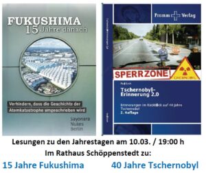 40 Jahre ist eine lange Zeit – mehr als eine Generation! Tschernobyl ist für viele Menschen ein historisches Ereignis, dass sie nur aus den Geschichtsbüchern oder von TV-Dokumentationen kennen. Die Katastrophe vom japanischen Fukushima dürfte hingegen eher im Gedächtnis von vielen Menschen verankert sein, da dies „erst“ vor 15 Jahren passierte. Aber auch das ist eine lange Zeit – und vor allem ist Japan weit weg. Für die Wunschkiste am 23. April um 20:00 h werden zum Thema 15 Jahre Fukushima und 40 Jahre Tschernobyl Menschen berichten, die beides selbst (mit mehr oder weniger Abstand) erlebt haben.